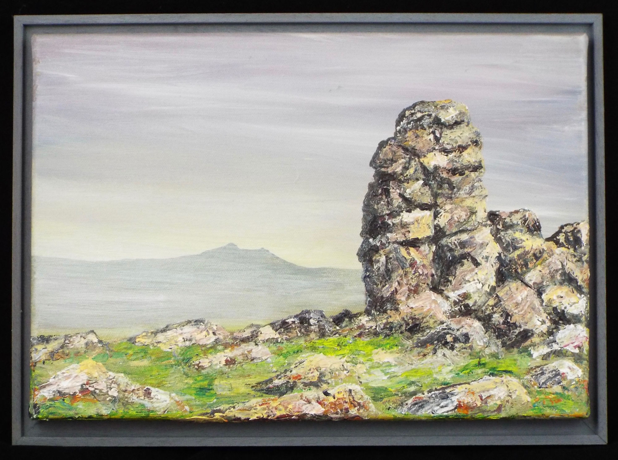 A semi abstract painting on canvas showing the textured granite surface of hound Tor, looking towards Hay Tor.