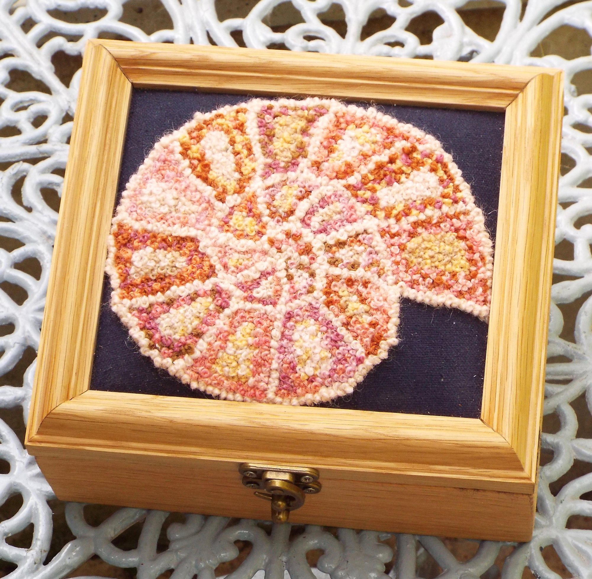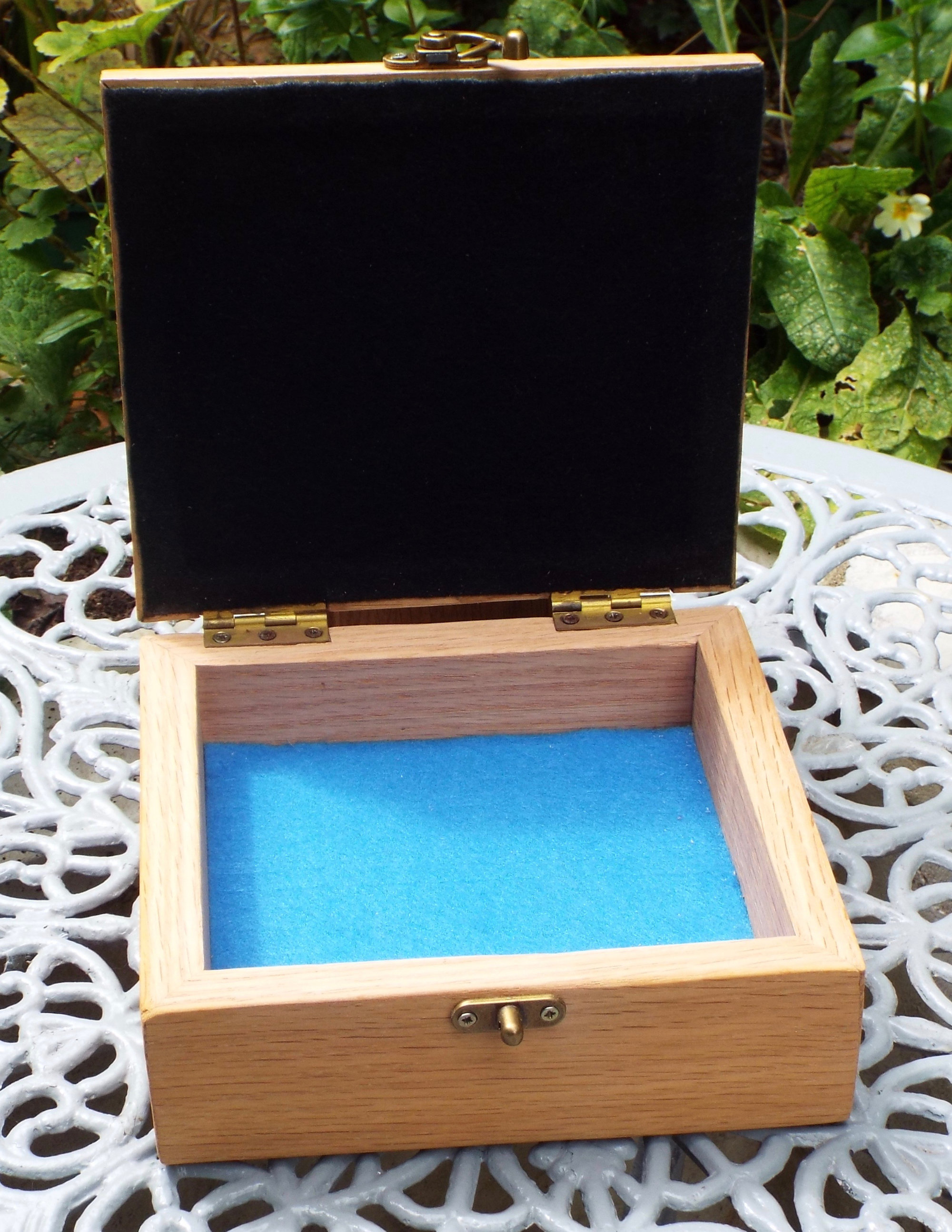 An oak box with a hand embroidered crewel work gillyflower on the lid, hand stitched by Richard's wife Anne. The oak box is lined and finished with a natural beeswax polish and has brass hinges and closure clasp. This box would make an attractive jewellery box or as an heirloom keepsake.