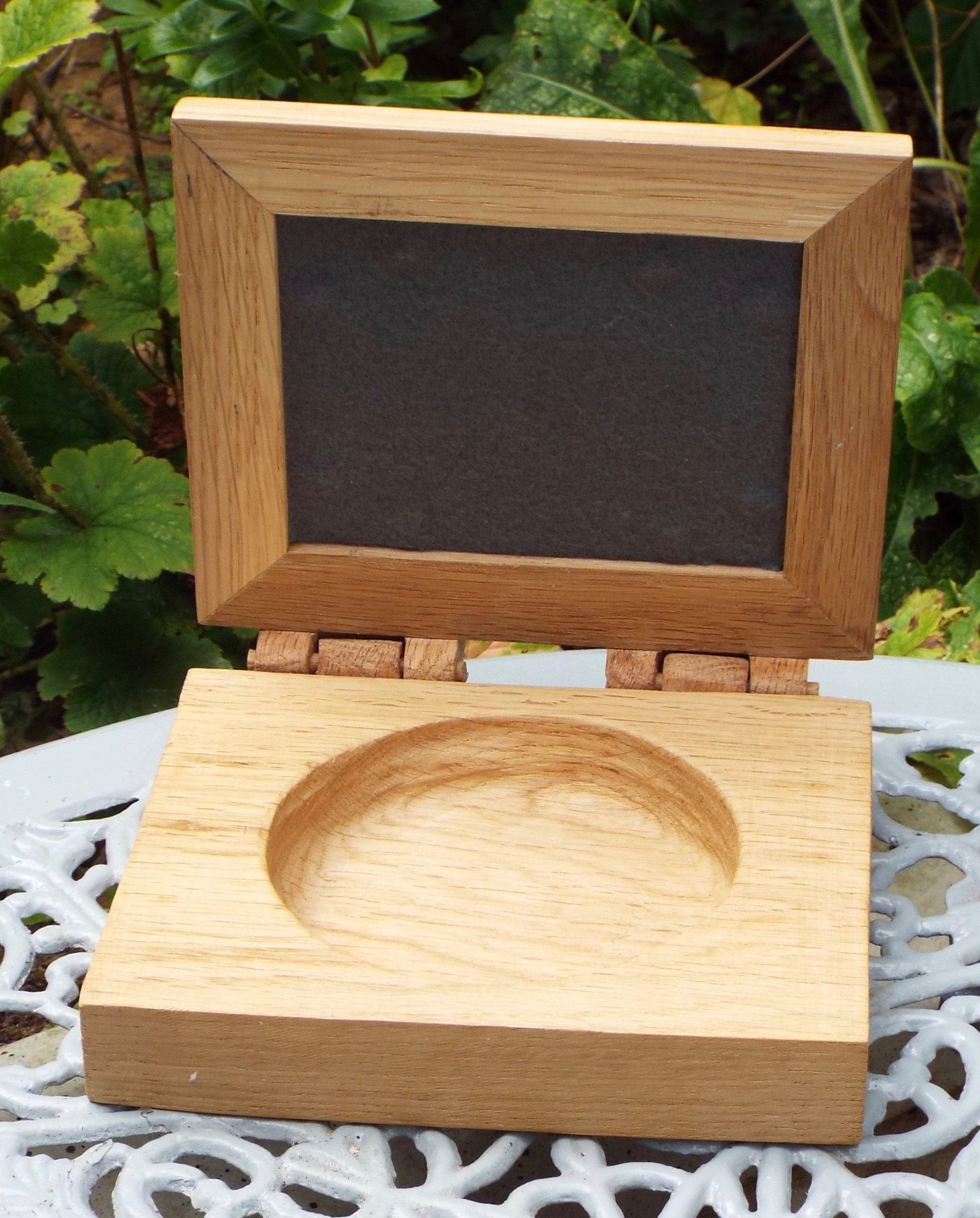 An oak box featuring an original acrylic painted goldfinch on the lid. The box has a round recessed interior suitable for small jewellery items and features wooden hinges also made in oak.