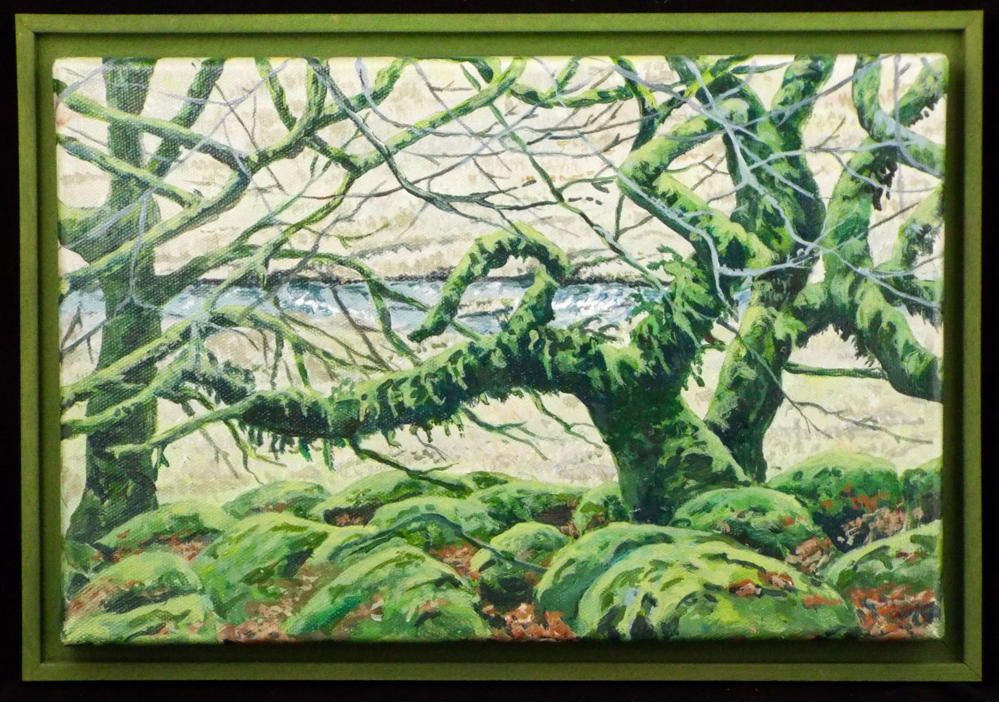 A framed canvas depicting one of the stunted moss and fern cloaked oak trees in Wistman's Wood high on the slopes of Dartmoor.