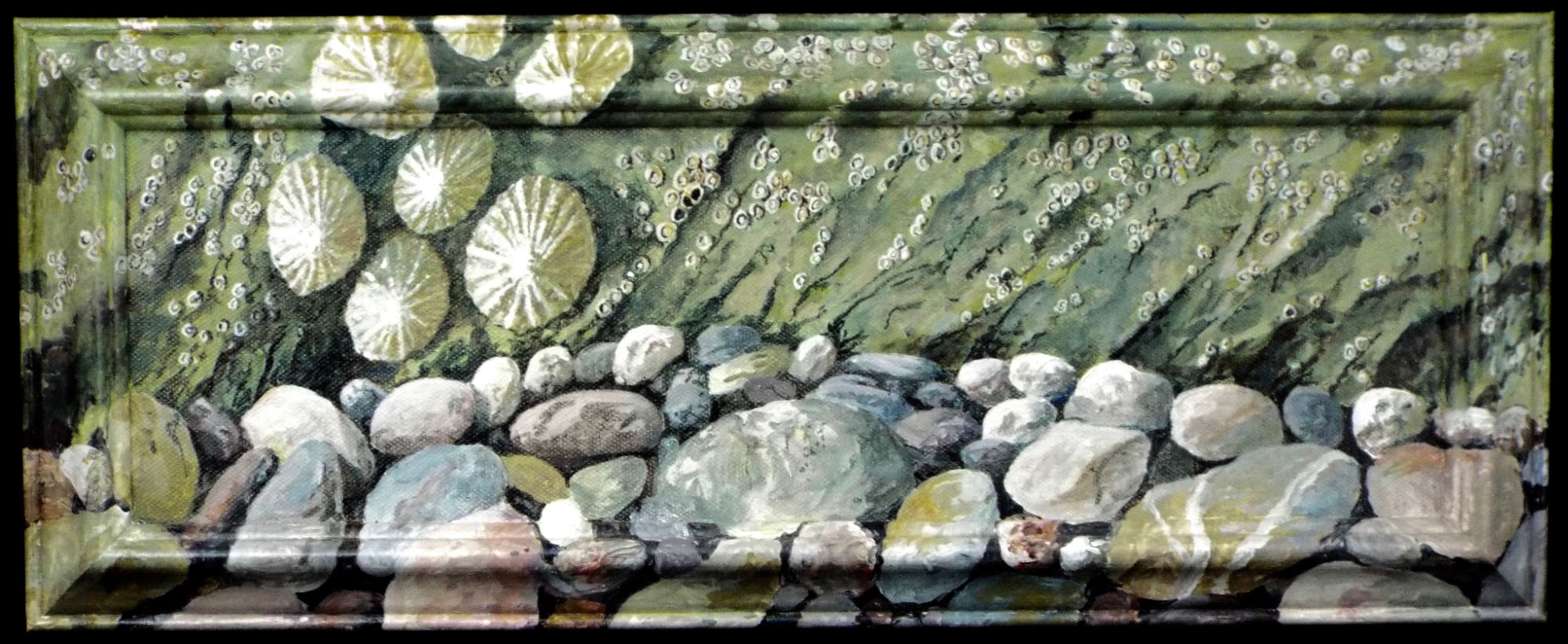 An unusual design for a painting with the image painted onto the frame itself. The contours of the picture moulding echo the shapes of the limpet shells.