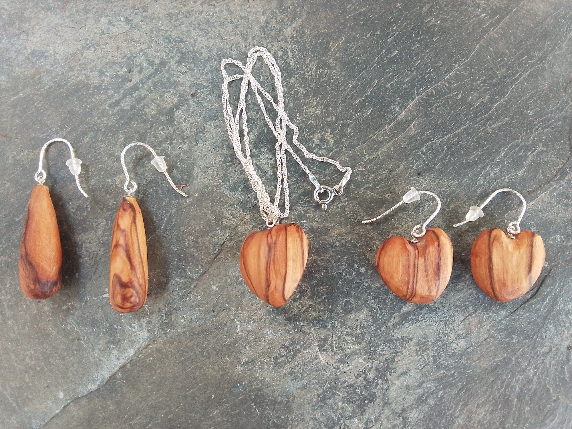 Bethlehem olive wood and silver earrings and pendant. Please click the image above for a larger view.