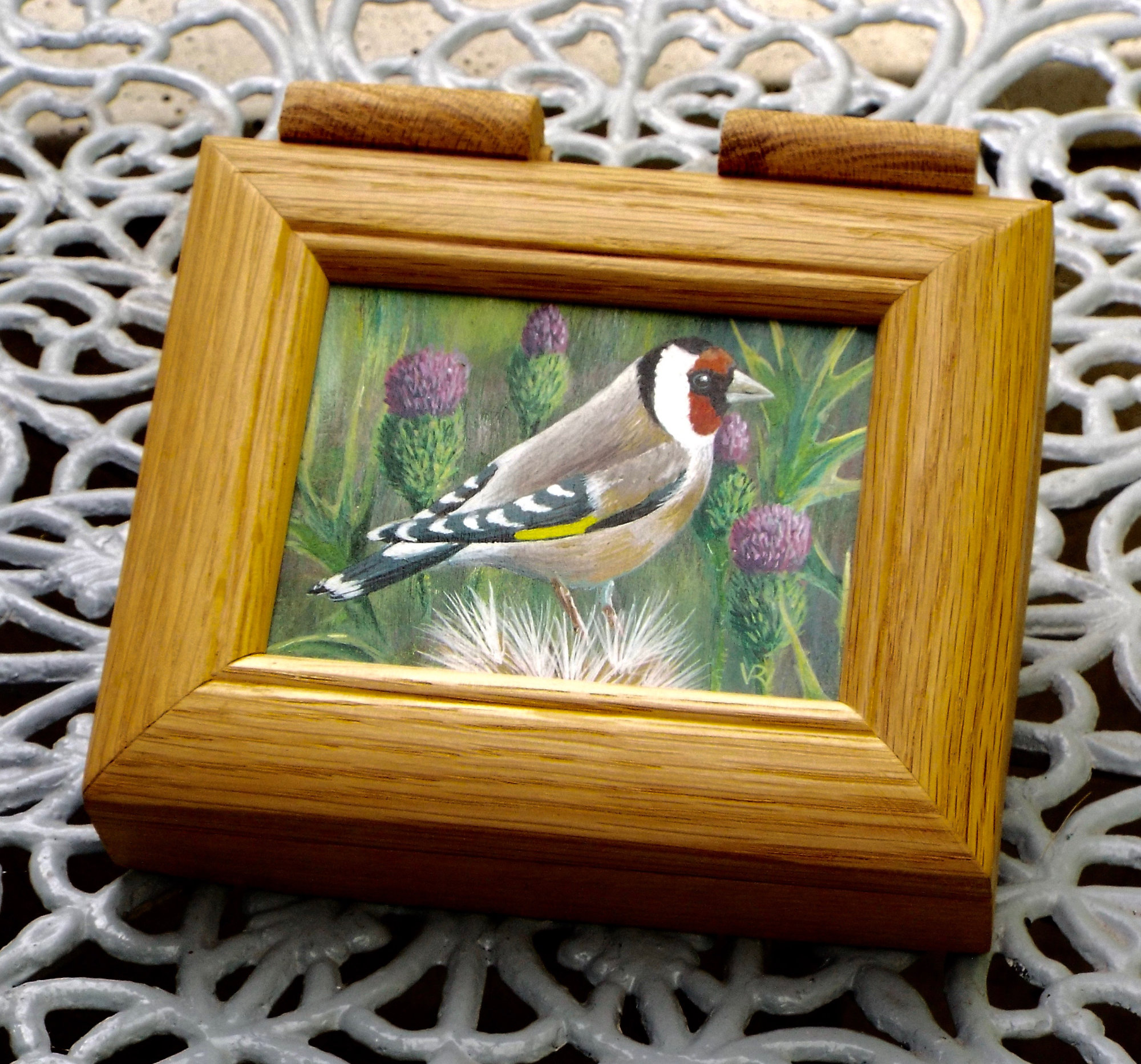 An oak box featuring an original acrylic painted goldfinch on the lid. The box has a round recessed interior suitable for small jewellery items and features wooden hinges also made in oak.