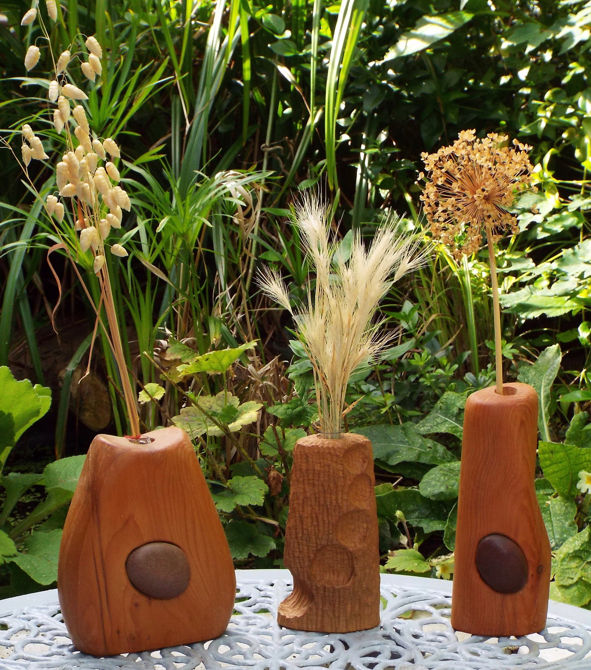 These bud vases are a different way for displaying a few fresh flowers or dried stems and grasses. Each has a plastic test tube so that a few fresh stems can be kept in water. Different native woods are used and some have pebbles added to the design or are painted. Please email Richard if you have a particular vase in mind or would like to see current stock items.